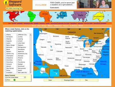 Class Discussion: Discuss (as a class) how technology could be used to address adapt content for this class, when the lesson features learning the Names of the States using the Seterra online game site for matching the names of State Capitals, displayed to the whole class on an interactive white board (as shown below).